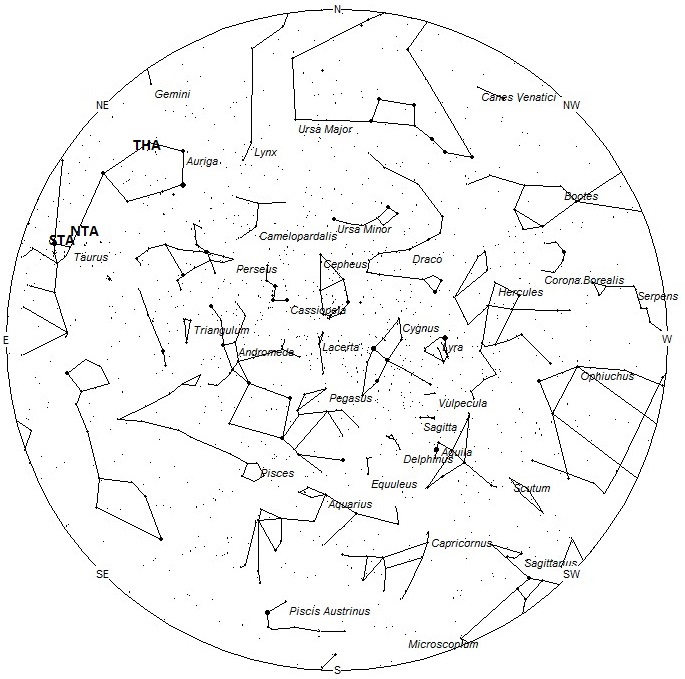The Northern Taurids (NTA) are active from a large radiant located at 04:26 (066) +25. This area of the sky is located in northern Taurus, 9 degrees north of the bright orange star known as Aldebaran (alpha Tauri). This position is close to the Southern Taurids so great care must be taken in separating these meteors. You must have the two radiants near the center of your field of view to properly differentiate these sources. Current rates would be 3 per hour as seen from the northern hemisphere and 2 per hour as seen from south of the equator. These meteors may be seen all night long but the radiant is best placed near midnight local standard time (LST) when it lies on the meridian and is located highest in the sky. With an entry velocity of 28 km/sec., the average Northern Taurid meteor would be of slow velocity.