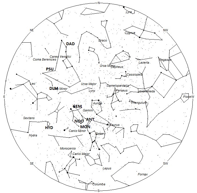 The Sigma Hydrids (HYD) are active from November 26 through December 21, with maximum activity occurring on December 6. The radiant is currently located at 08:28 (127) +02 , which places it in extreme western Hydra, 2 degrees southwest of the 4th magnitude star known as sigma Hydrae. These meteors are best seen near 0400 LST when the radiant lies highest above the horizon. Hourly rates are expected to be near 3 no matter your location. With an entry velocity of 61 km/sec., most activity from this radiant would be of swift speed.