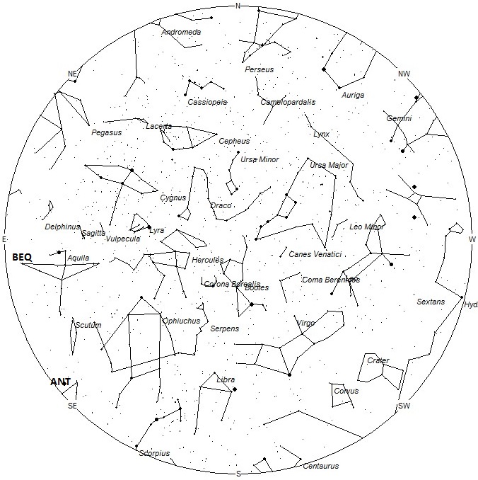 The radiant (the area of the sky where meteors appear to shoot from) positions and rates listed below are exact for Saturday night/Sunday morning June 16/17. These positions do not change greatly day to day so the listed coordinates may be used during this entire period. Most star atlases (available at science stores and planetariums) will provide maps with grid lines of the celestial coordinates so that you may find out exactly where these positions are located in the sky. A planisphere or computer planetarium program is also useful in showing the sky at any time of night on any date of the year. Activity from each radiant is best seen when it is positioned highest in the sky, either due north or south along the meridian, depending on your latitude. It must be remembered that meteor activity is rarely seen at the radiant position. Rather they shoot outwards from the radiant so it is best to center your field of view so that the radiant lies near the edge and not the center. Viewing there will allow you to easily trace the path of each meteor back to the radiant (if it is a shower member) or in another direction if it is a sporadic. Meteor activity is not seen from radiants that are located far below the horizon. The positions below are listed in a west to east manner in order of right ascension (celestial longitude). The positions listed first are located further west therefore are accessible earlier in the night while those listed further down the list rise later in the night.