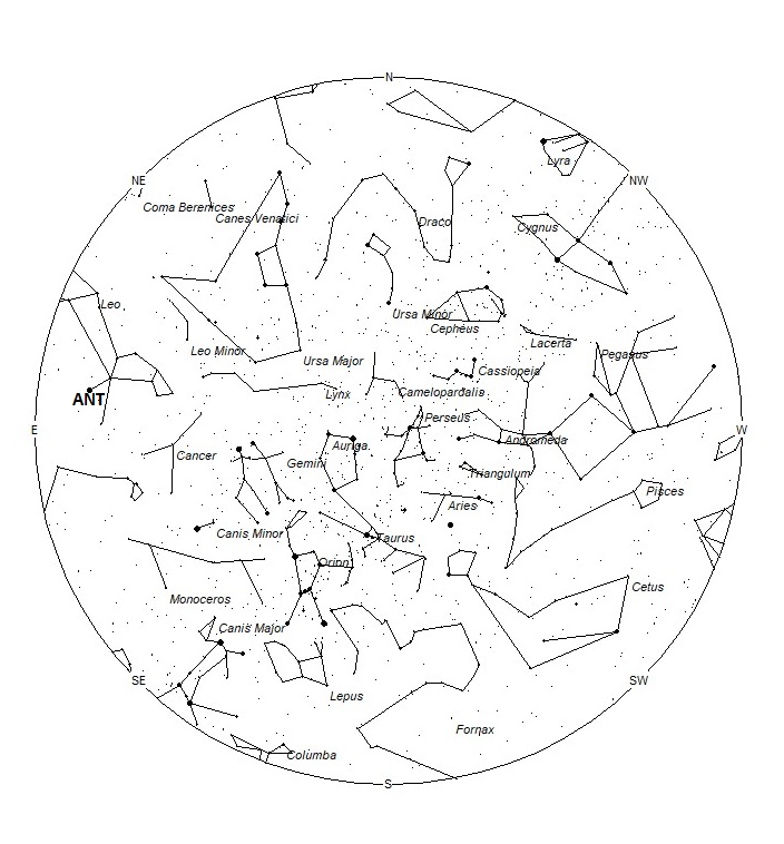 The Anthelion (ANT) radiant is active from a position located at 10:04 (151) +12. This position lies in western Leo, just west of the 1st magnitude star known as Regulus (alpha Leonis). This radiant is a very large oval some thirty degrees wide by fifteen degrees high. Activity from this radiant can appear from more than one constellation., This week these meteors can also be seen from eastern Cancer as well as western Leo. The position listed here is for the center of the radiant. This radiant is best placed near 01:00 Local Standard Time (LST) when it lies on the meridian and is highest in the sky. Rates at this time should be near 2 per hour as seen from the northern hemisphere and 1 per hour as seen from south of the equator. With an entry velocity of 30 km/sec., the average Anthelion meteor would be of slow velocity.