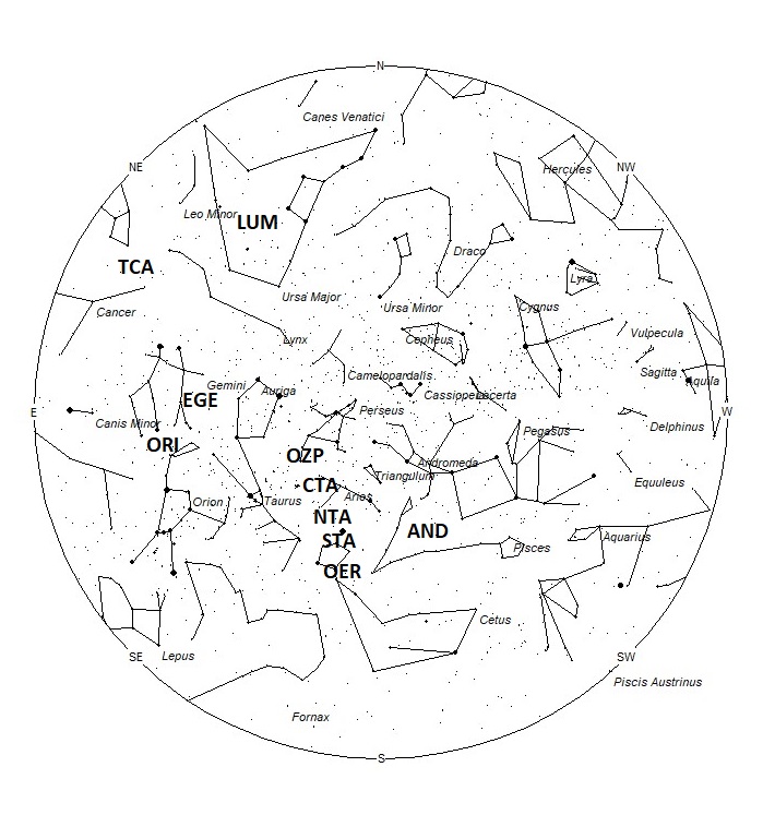 The Northern Taurids (NTA) are active from a radiant located at 02:48 (42) +18. This area of the sky is located in central Aries, near the spot occupied by the faint star known as pi Arietis. To best see these meteors, one should face southward near 01:00 LST. Note that this radiant is only 6 degrees north of the STA radiant so care must be taken to separate these two showers. Maximum activity is not until November 12th so rates at this time should be near 1 per hour no matter your location. With an entry velocity of 31 km/sec., the average NTA meteor would be of medium-slow velocity.