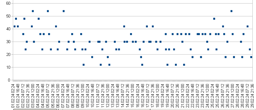 Figure 1 – The result with the calculated hourly numbers of meteor echoes by listening to the radio signals during February 2024.