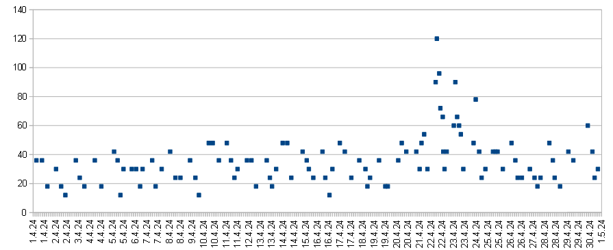 Figure 3 – The result with the calculated hourly numbers of meteor echoes by listening to the radio signals during April 2024.