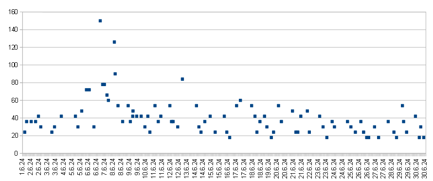 Figure 5 – The result with the calculated hourly numbers of meteor echoes by listening to the radio signals during June 2024.