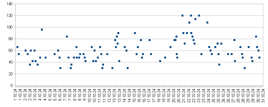 Figure 9 – The result with the calculated hourly numbers of meteor echoes by listening to the radio signals during October 2024.