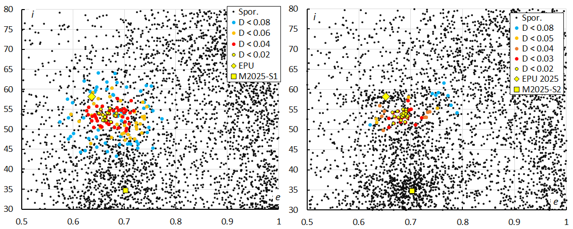 Figure 10 – Diagram of inclination i versus the eccentricity e, color coded for different threshold classes of the orbit similarity criteria. At left the plot for 2024 when M2024-S1 was discovered, sampled during the entire activity period, λʘ[176.0–187.0]. At right the plot for 2025, limited to the nights with highest activity λʘ[178.0–184.0]. The positions of two other outbursts in 2025, EPU#1044 and M2025-S2 are indicated by a yellow diamond and a yellow square.