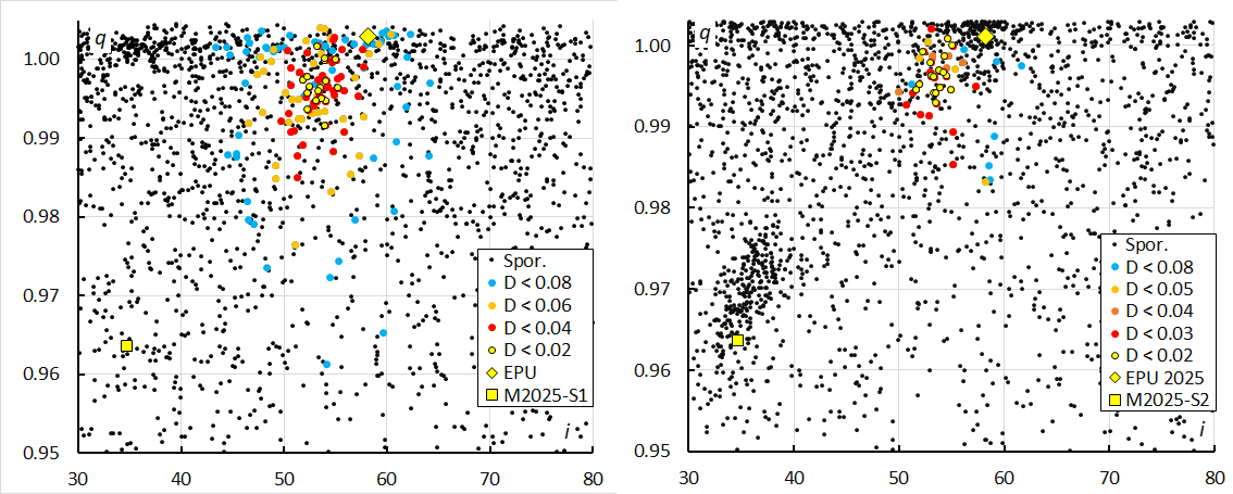 Figure 11 – Diagram of perihelion distance q versus the inclination i, color coded for different thresholds classes of the orbit similarity criteria. At left the plot for 2024 when M2024-S1 was discovered, sampled during the entire activity period, λʘ[176.0–187.0]. At right the plot for 2025, limited to the nights with highest activity λʘ[178.0–184.0]. The positions of two other outbursts in 2025, EPU#1044 and M2025-S2 are indicated by a yellow diamond and a yellow square.