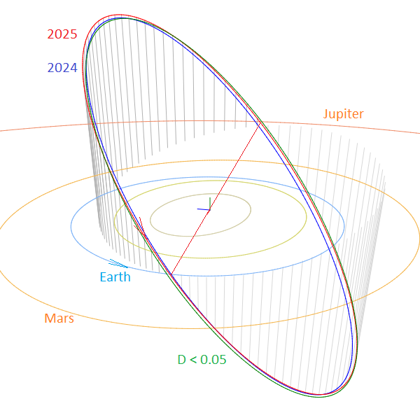 Figure 12 – Comparing the mean orbits for the solutions for M2024-S1 based on the shower identification according to two methods, blue is for 2024 data, red for 2025 data and green for the other shower search method with DD < 0.05 in Table 1, close-up at the inner Solar System. (Plotted with the Orbit visualization app provided by Pető Zsolt).