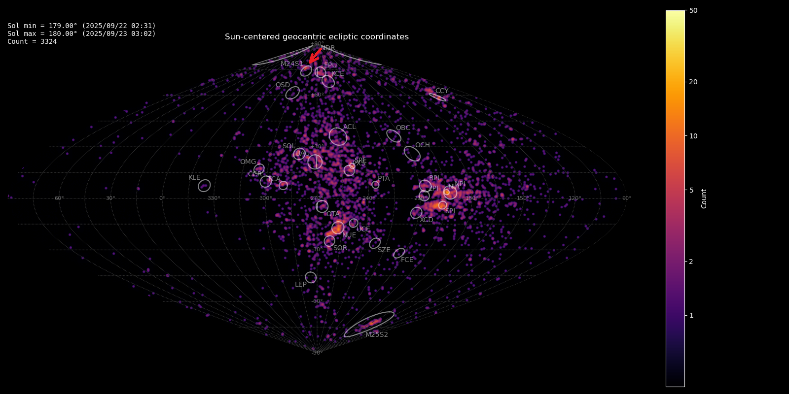 Figure 1 – Radiant plot of the Global Meteor Network data for 2025 September 22–23 in Sun-centered geocentric ecliptic coordinates. The new radiant is visible at high ecliptic altitude and marked by a red arrow.