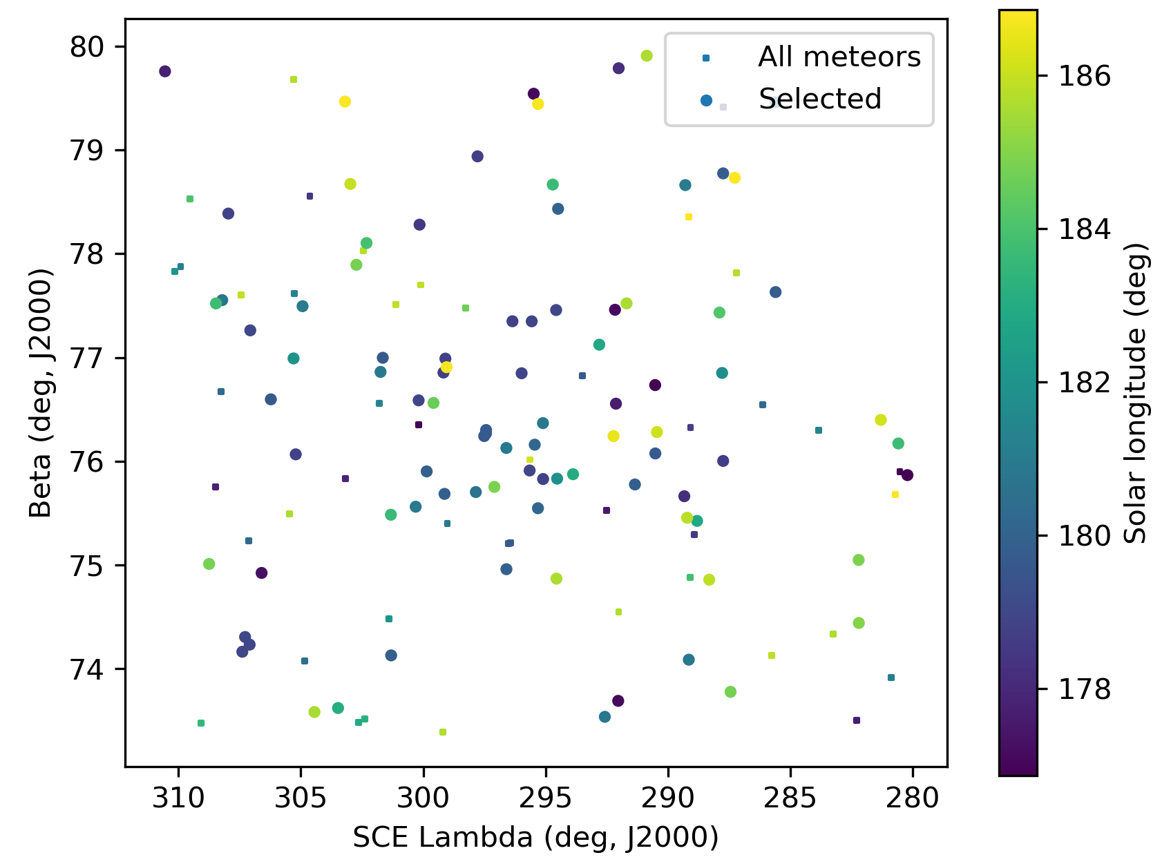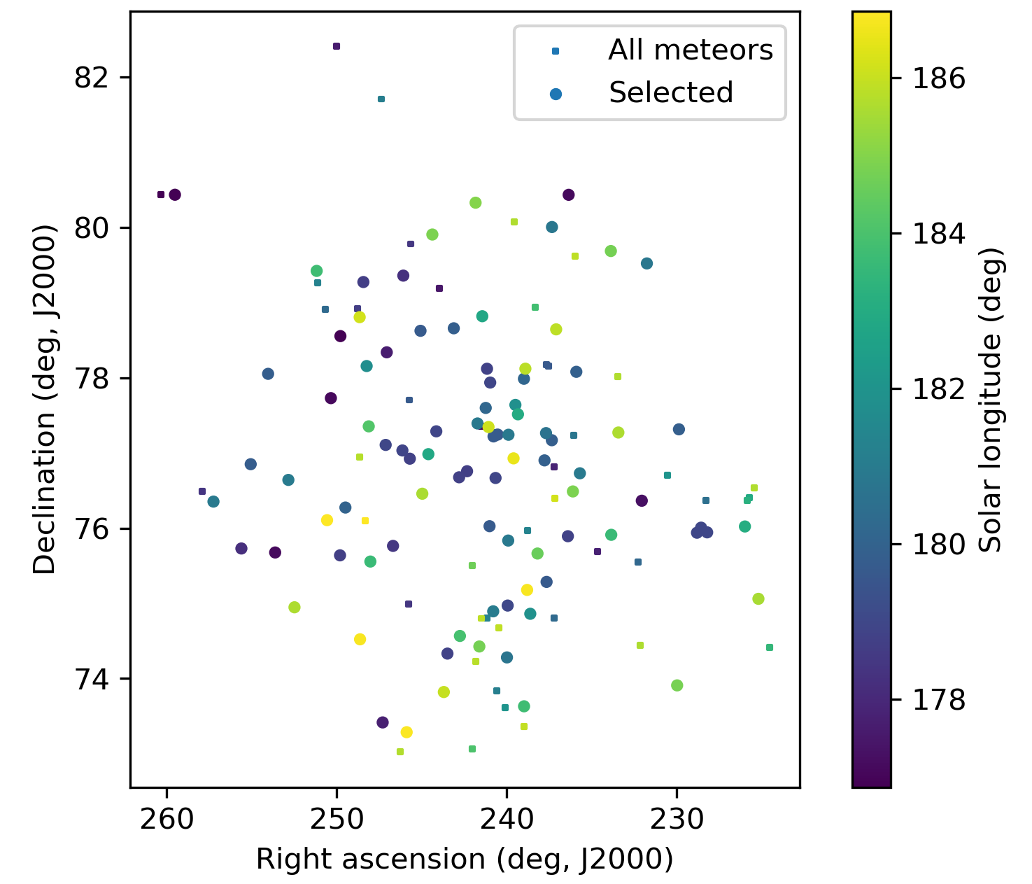 The visible concentration of radiant points was extracted for the time interval of 178° < λʘ < 184°, arbitrarily limited in Sun-centered geocentric ecliptic coordinates with