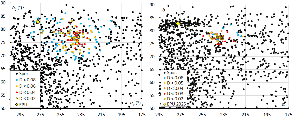 Figure 6 – The radiant distribution in equatorial coordinates, color coded for different threshold classes of the orbit similarity criteria. At left the plot for 2024 when M2024-S1 was discovered, λʘ[176.0–187.0], at right the plot for 2025, λʘ[178.0–184.0].
