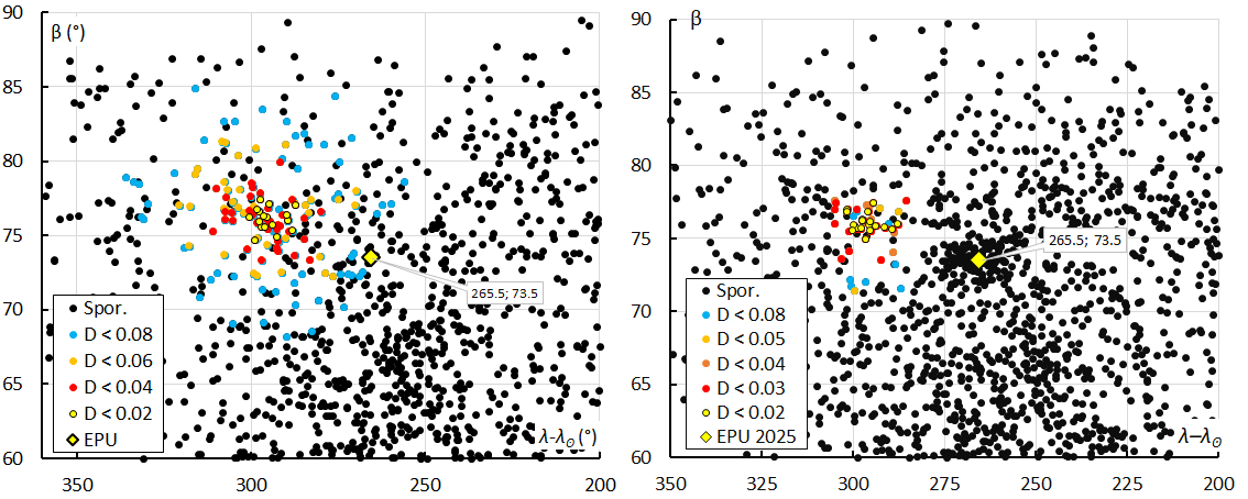 Figure 7 – The radiant distribution in Sun-centered geocentric ecliptic coordinates, color coded for different threshold classes of the orbit similarity criteria. At left the plot for 2024 when M2024-S1 was discovered, λʘ[176.0–187.0], at right the plot for 2025, λʘ[178.0–184.0].