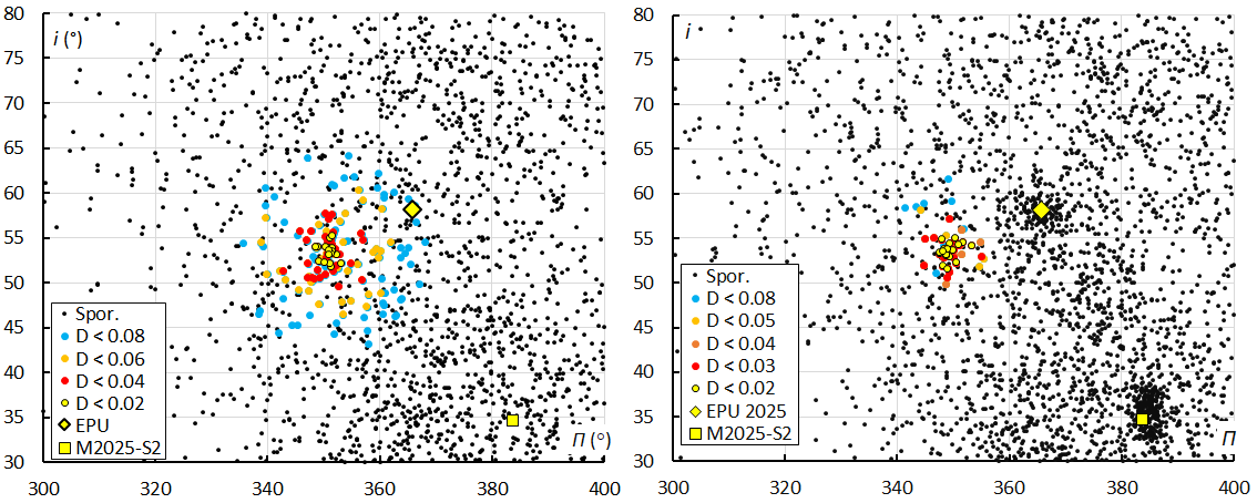 Figure 8 – Diagram of inclination i versus the longitude of perihelion Π, color coded for different threshold classes of the orbit similarity criteria. At left the plot for 2024 when M2024-S1 was discovered, sampled during the entire activity period, λʘ[176.0–187.0]. At right the plot for 2025, limited to the nights with highest activity λʘ[178.0–184.0]. The positions of two other outbursts in 2025, EPU#1044 and M2025-S2 are indicated by a yellow diamond and a yellow square.