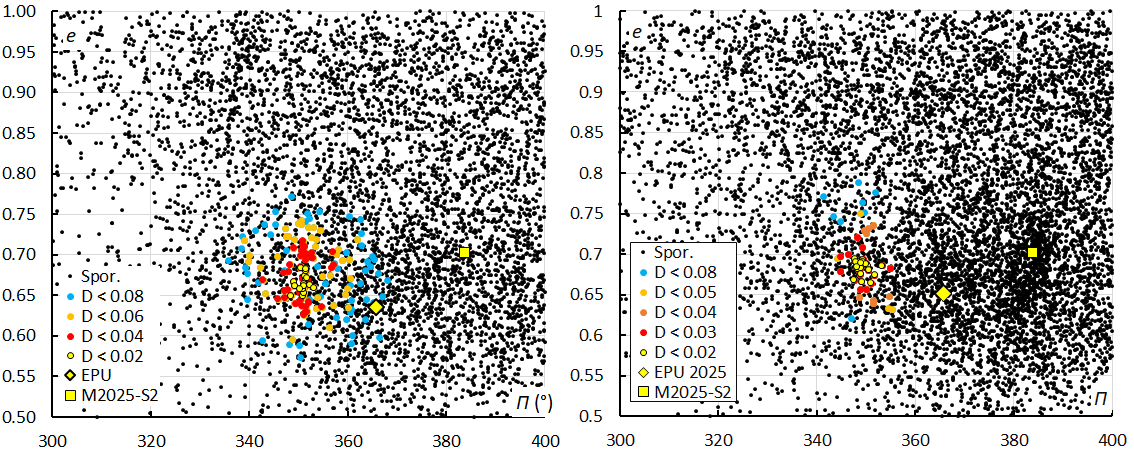 Figure 9 – Diagram of eccentricity e versus the longitude of perihelion Π, color coded for different threshold classes of the orbit similarity criteria. At left the plot for 2024 when M2024-S1 was discovered, sampled during the entire activity period, λʘ[176.0–187.0]. At right the plot for 2025, limited to the nights with highest activity λʘ[178.0–184.0]. The positions of two other outbursts in 2025, EPU#1044 and M2025-S2 are indicated by a yellow diamond and a yellow square.