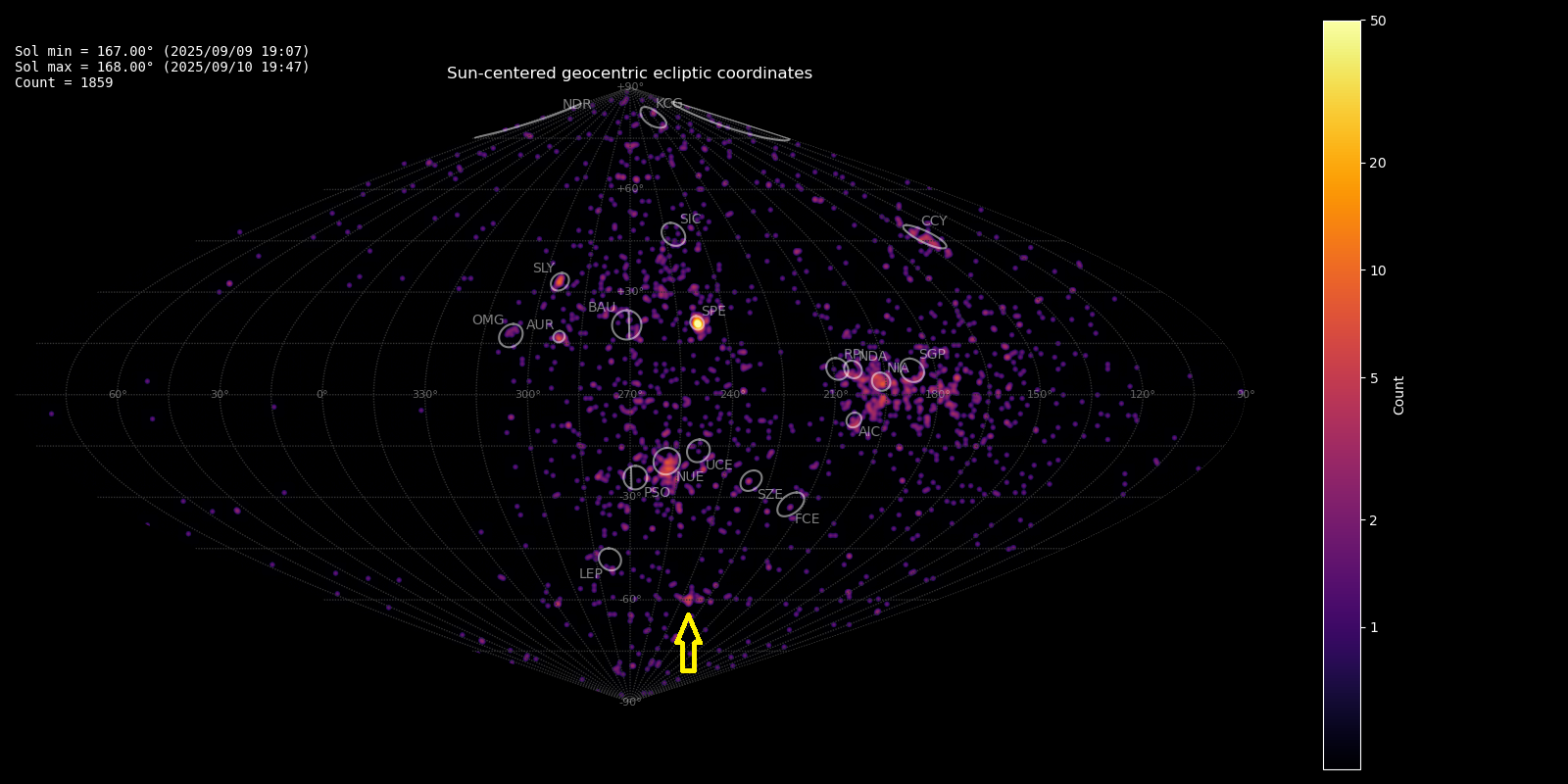 Figure 1 – Heat map with 1859 radiants obtained by the Global Meteor network in 9–10 September, 2025. The position of the delta-Horologiids in Sun-centered geocentric ecliptic coordinates is marked with a yellow arrow.