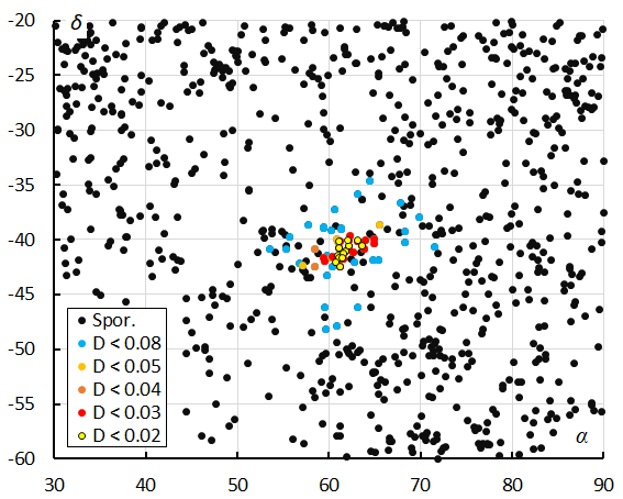 The Rayleigh distribution fit pointed at a DD value of 0.05 as the orbital similarity threshold value cutoff (Figure 7). This method resulted in a mean orbit with 31 related orbits that fit within the similarity threshold with DSH < 0.125, DD < 0.05 and DJ < 0.125, recorded 2025 September 5 – 14. The plot of the radiant positions in equatorial coordinates, color coded for different D-criteria thresholds, shows a clear concentration in Right Ascension from about 57° to 66° and –38° to –43° in declination (Figure 9), see also Figure 4.
