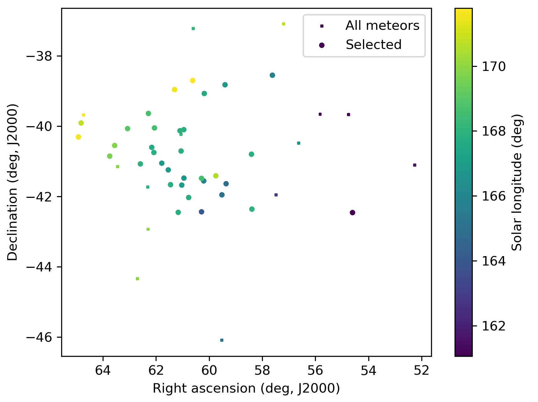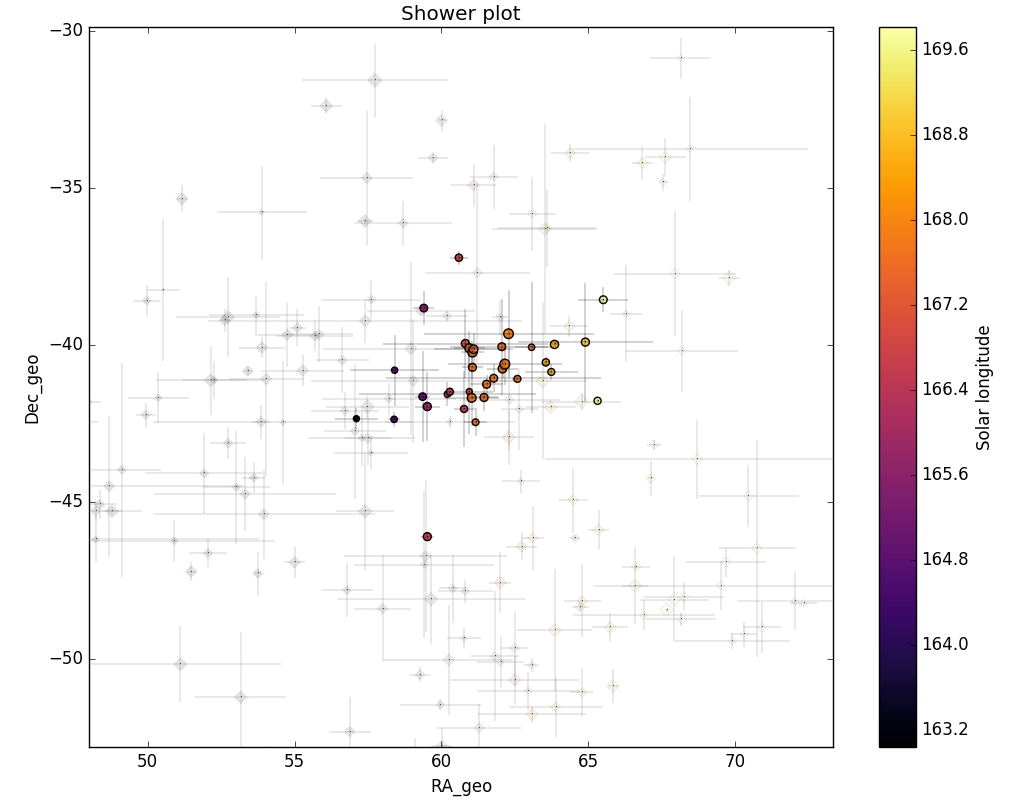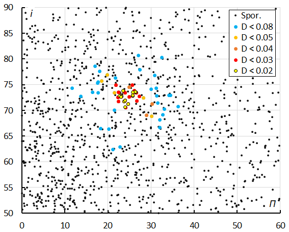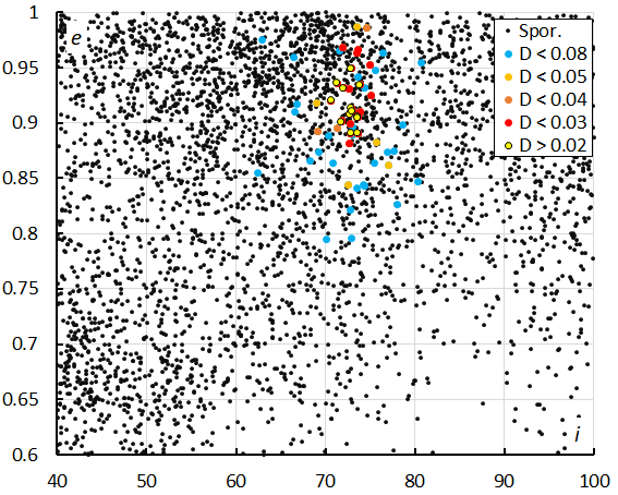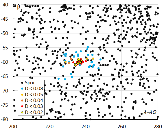 220° < λ–λʘ < 250° and –48° < β < –69°. This selection includes most of the possible meteor shower members as well as the sporadic sources within this interval. This preselection included 162 meteor orbits, used to compute a first mean orbit for this sample. We didn’t use median values to derive a mean orbit since a vectoral solution like the method of Jopek et al. (2006) is more appropriate for orbital elements with angular values.