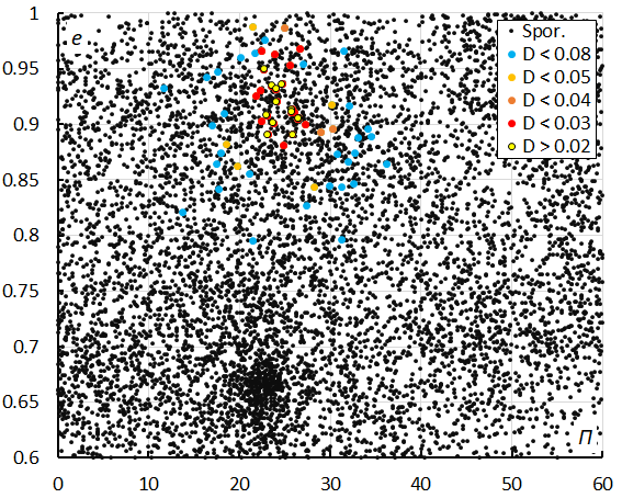 Figure 11 – Diagram of eccentricity e versus the longitude of perihelion Π, color coded for different threshold classes of the orbit similarity criteria.