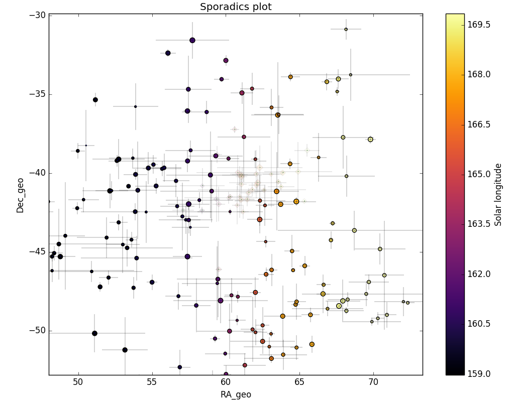 The visible concentration of radiant points was extracted for the time interval of 161° < λʘ < 172°, arbitrarily limited in Sun-centered geocentric ecliptic coordinates with