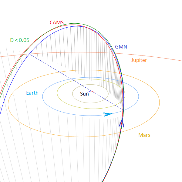 Figure 13 – Comparing the mean orbits for different solutions, blue is based on the GMN method, green for the D-criteria method with DD < 0.05 and red for CAMS data in Table 1, close-up at the inner Solar System. (Plotted with the Orbit visualization app provided by Pető Zsolt).