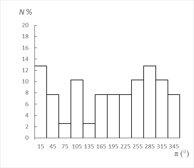I. I. Putilin discovered a dependence of the distribution of the longitude of perihelion on eccentricity. ‘The greater the eccentricity of the orbit, the more pronounced the tendency of perihelia to group around a certain longitude’, he wrote (Terentjeva and Barabanov, 2016). In the work mentioned, this dependence is confirmed on the system of the Eccentrid asteroids of the Earth group (Q≤ 1.1 AU). In our case with the Eccentrids of the Mars family, this dependence is even more pronounced (Figure 1). Among the population of 39 Eccentrid asteroids of the Mars family, orbits with e= 0.5 account for 44%, and those with e = 0.6–0.7 account for 26%. Apparently, on average, e of the Eccentrids of the Mars family is higher than that of the Eccentrids of the Earth group.