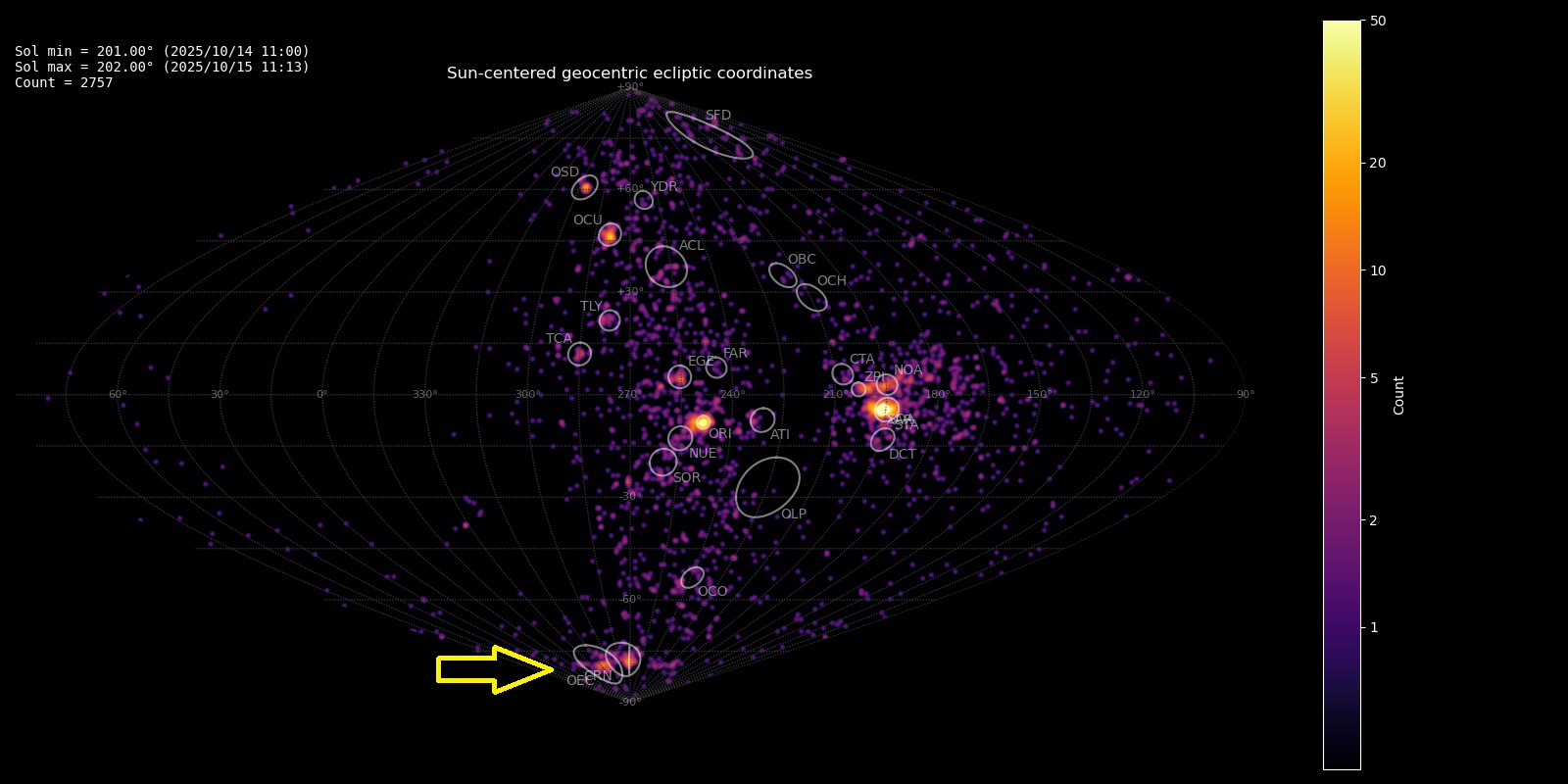 Figure 1 – Radiant density map with 2757 radiants obtained by the Global Meteor Network during 14–15 October, 2025. The position of the October epsilon-Carinids in Sun-centered geocentric ecliptic coordinates is marked with a yellow arrow.
