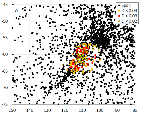 This method resulted in a mean orbit with 98 related orbits that fit within the similarity threshold with DSH < 0.075, DD < 0.03 and DJ < 0.075 between October 10 and 17 in the period 2023 to 2025. The plot of the radiant positions in equatorial coordinates, color-coded for different D-criteria thresholds, has its radiant at 110.4° in Right Ascension and –60.9° in declination (Figure 10). A slightly more tolerant threshold of the D-criteria with DSH < 0.10, DD < 0.04 and DJ < 0.1 results in 173 orbits that fit these threshold values, but with a risk of including contamination with sporadics. Both solutions are mentioned in Table 1.