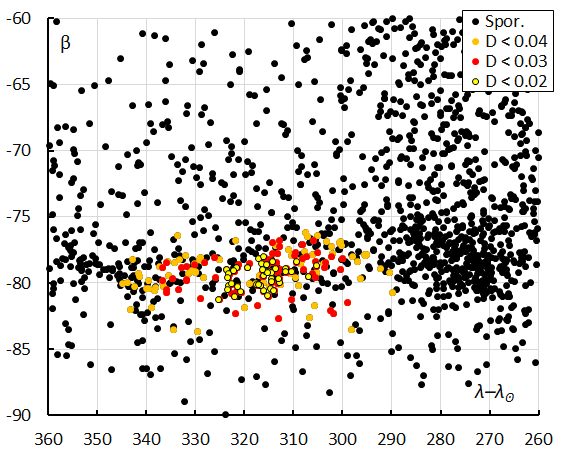 Figure 11 – The radiant distribution during the solar-longitude interval 196° – 207° in Sun-centered geocentric ecliptic coordinates, color-coded for different threshold values of the DD orbit similarity criterion.