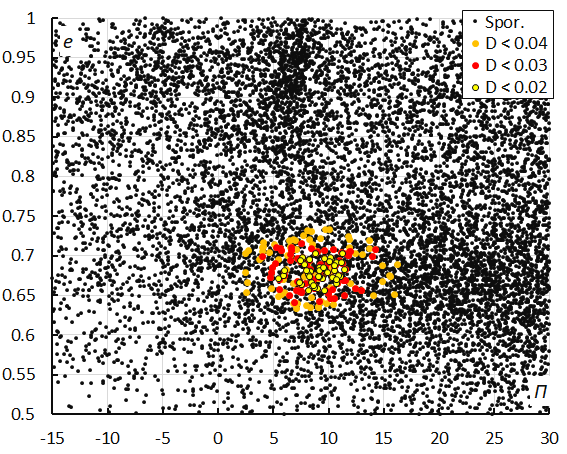Figure 14 – The diagram of the eccentricity e against the longitude of perihelion Π color-coded for different classes of D criterion threshold, for λʘ between 196° and 207°.