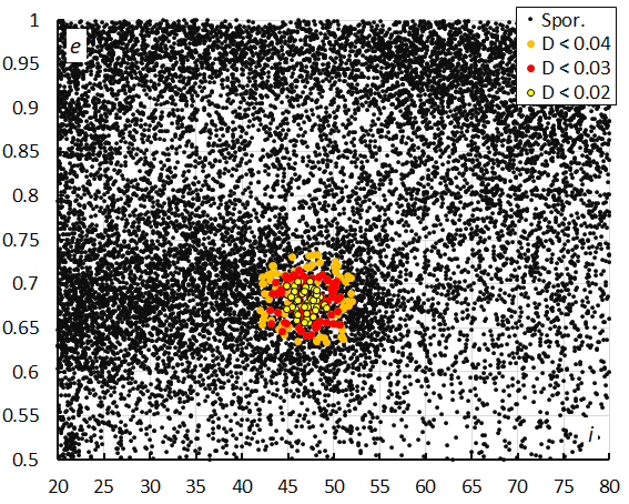 Figure 15 – The diagram of the eccentricity e against the inclination i color-coded for different classes of D criterion threshold, for λʘ between 196° and 207°.
