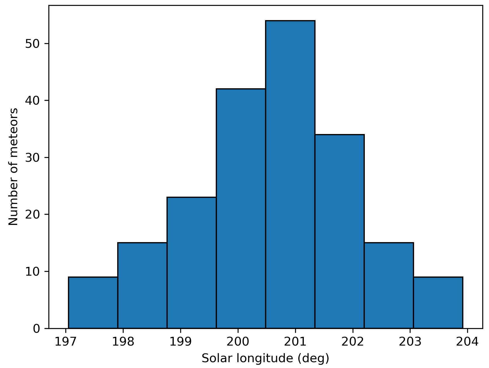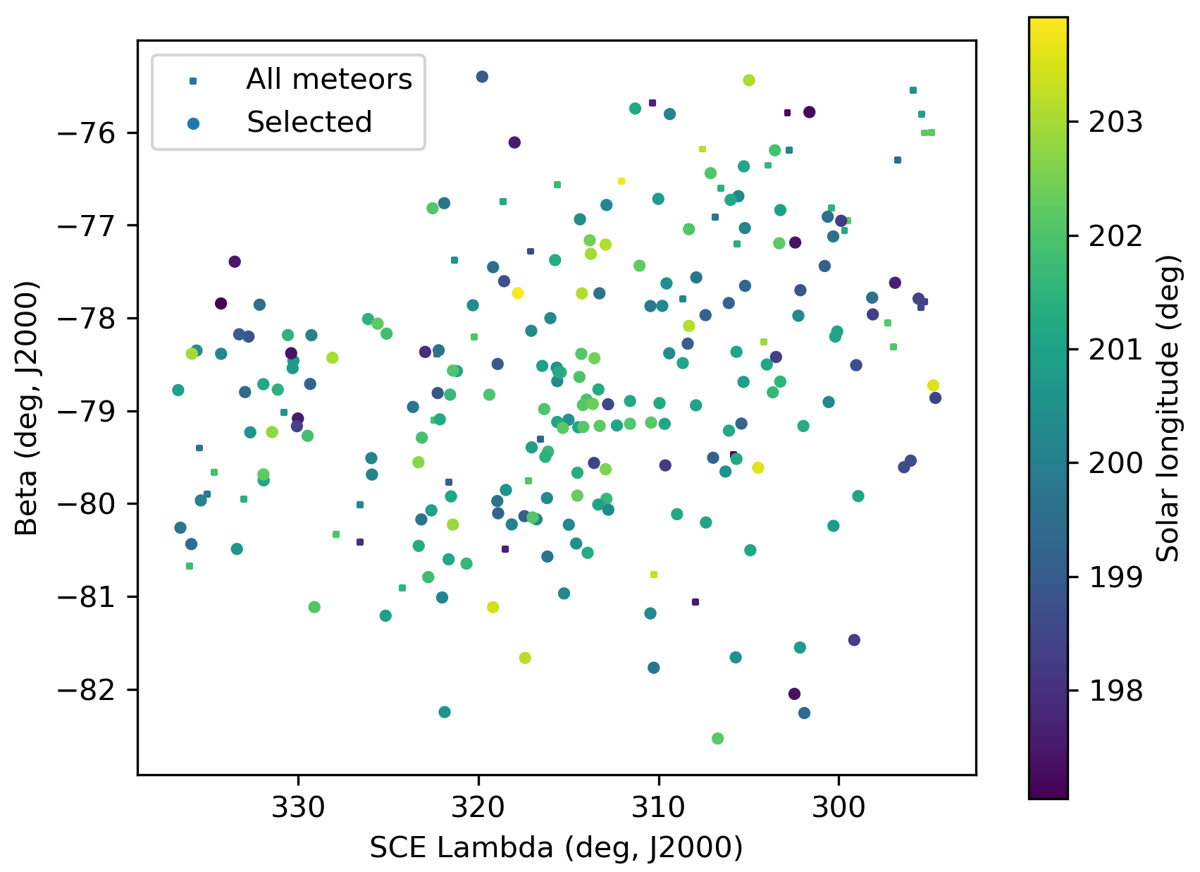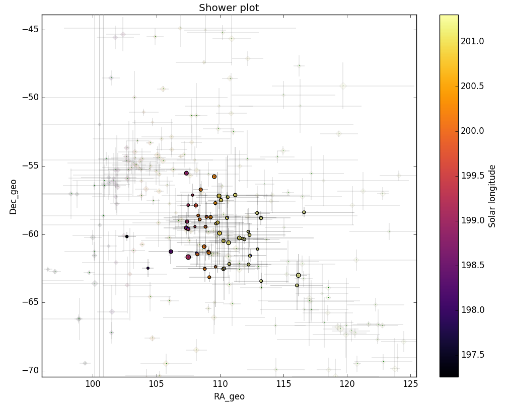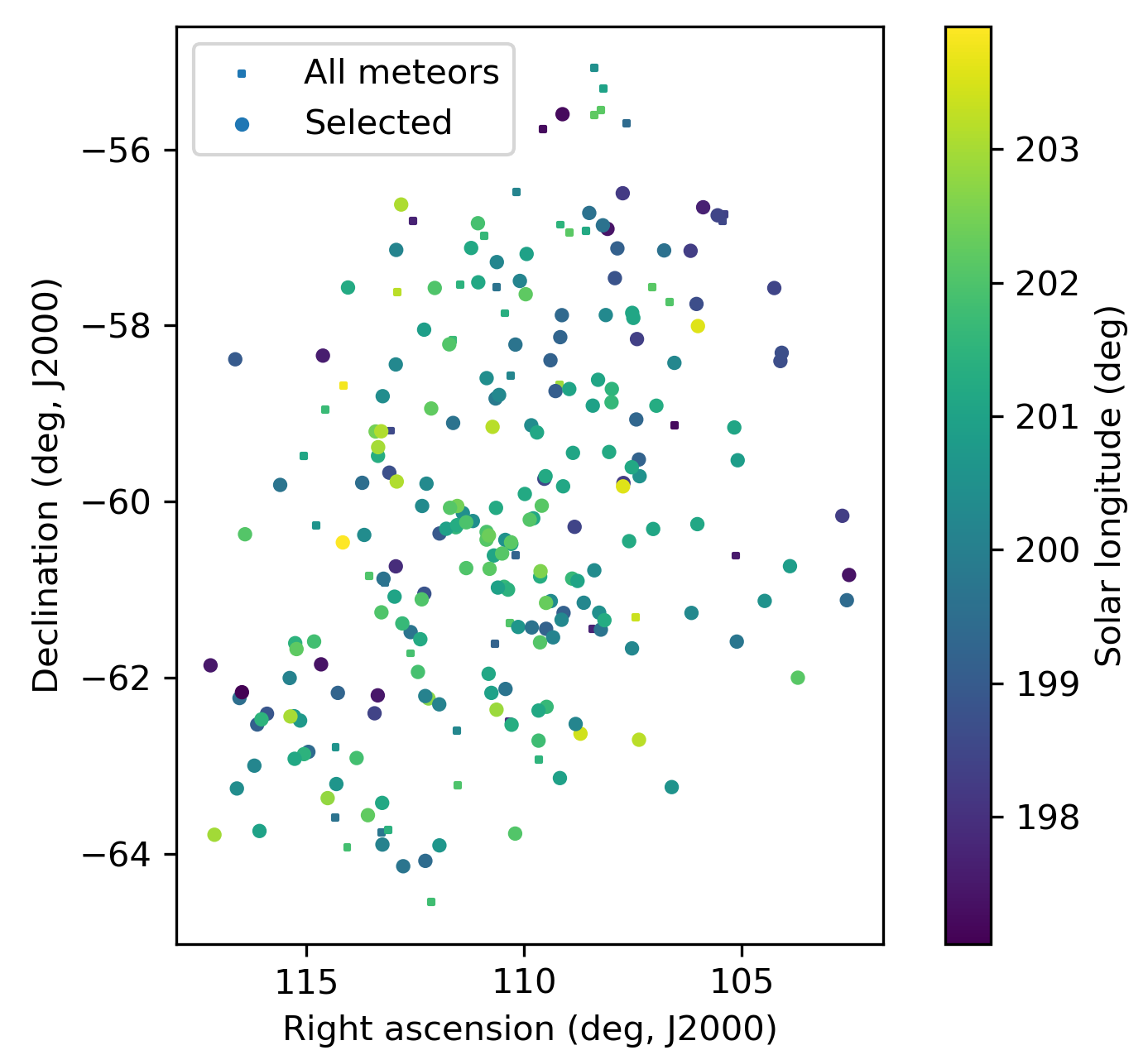 The GMN shower association criteria assume that meteors within 1° in solar longitude, within 5.1° in radiant in this case, and within 10% in geocentric velocity of a shower reference location are members of that shower. Further details about the shower association are explained in Moorhead et al. (2020). Using these meteor shower selection criteria, 201 orbits have been identified as October epsilon-Carinids.