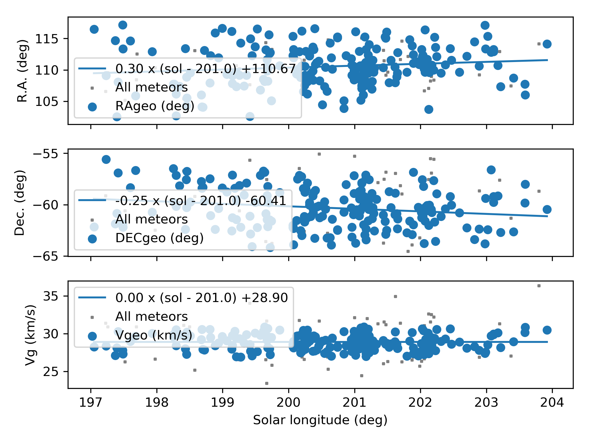 If we look at the ratio OEC-meteors to non-OEC-meteors recorded by GMN at the Southern Hemisphere (Figure 12) in 1.0°-time bins in solar longitude in steps of 0.25°, the best rates occurred around λʘ = 201.0°. The orbit-based shower identification found some orbits after λʘ = 204.0° but the main activity period is situated between solar longitude 197° and 204°. The bias caused by the fact that most GMN cameras at the Southern Hemisphere are installed in Australia and New Zealand, and with less coverage of other longitudes has been solved by combining data collected during three years (2023, 2024 and 2025) to cover the entire time span in solar longitude.