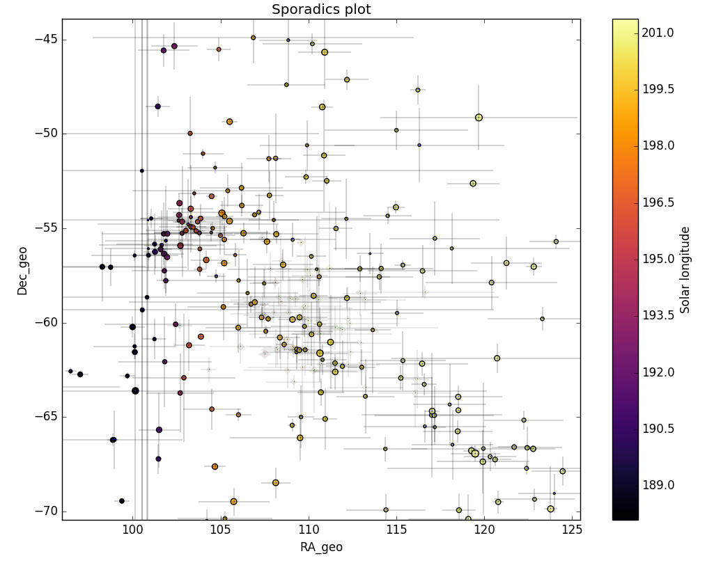 Figure 6 – All non-shower meteor radiants in geocentric equatorial coordinates during the shower activity. The pale diamonds represent the shower radiants plots, error bars represent two sigma values in both coordinates.