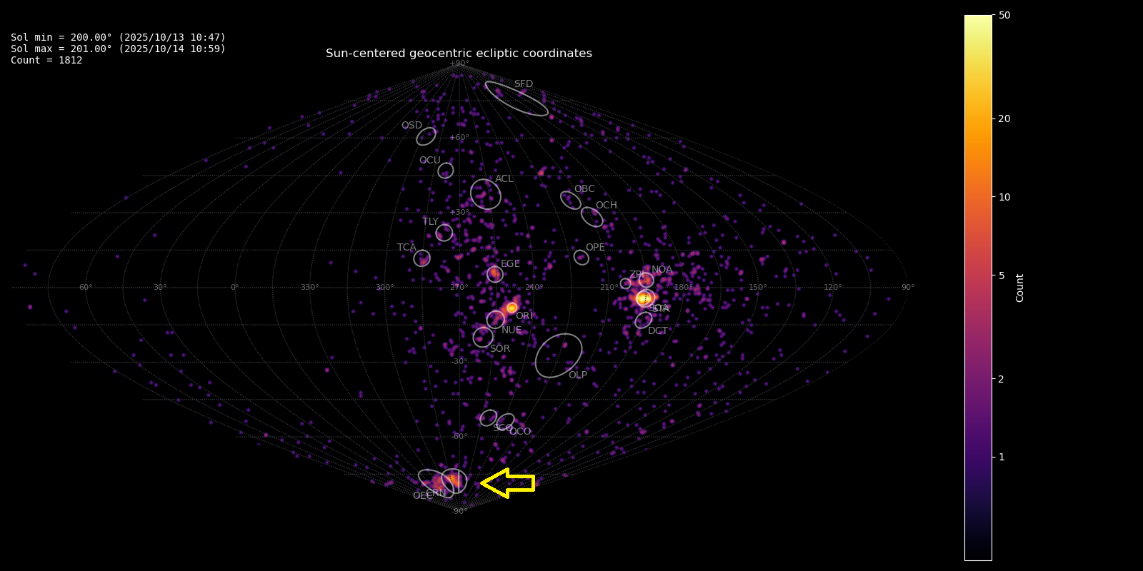 Figure 1 – Radiant density map (sinusoidal projection) with 1812 radiants obtained by the Global Meteor Network during 13–14 October, 2025. The position of the A Carinids in Sun-centered geocentric ecliptic coordinates is marked with a yellow arrow.