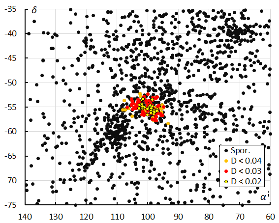 This method resulted in a mean orbit with 101 related orbits that fit within the similarity thresholds with DSH < 0.075, DD < 0.03 and DJ < 0.075, recorded October 10 – 18, 2025. The plot of the radiant positions in equatorial coordinates, color-coded for different D-criteria thresholds, has its radiant at 99.7° in Right Ascension and –55.1° in declination (Figure 10). A slightly more tolerant threshold of the D-criteria with DSH < 0.10, DD < 0.04 and DJ < 0.1 results in 126 orbits that fit these threshold values, but with a risk of including contamination with sporadics. Both solutions are mentioned in Table 1.