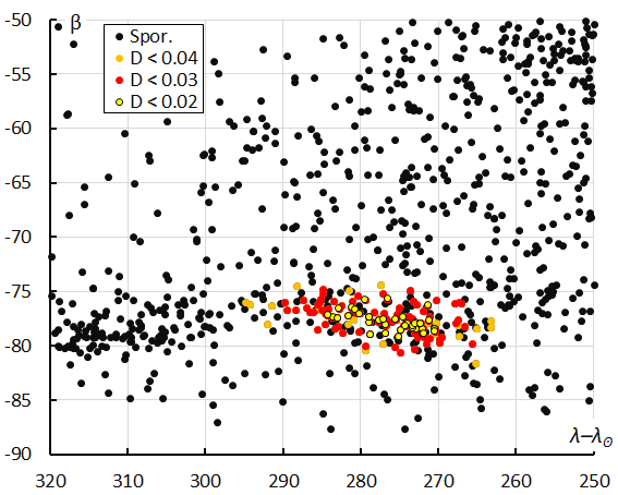 Figure 11 – The radiant distribution during the solar-longitude interval 196° – 207° in Sun-centered geocentric ecliptic coordinates, color-coded for different threshold values of the DD orbit similarity criterion.