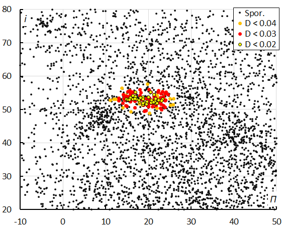 Figure 15 shows the concentration in eccentricity and inclination. The cloud left of the CRN-meteors are meteors identified by the radiant method as OEC and some weaker activity sources.