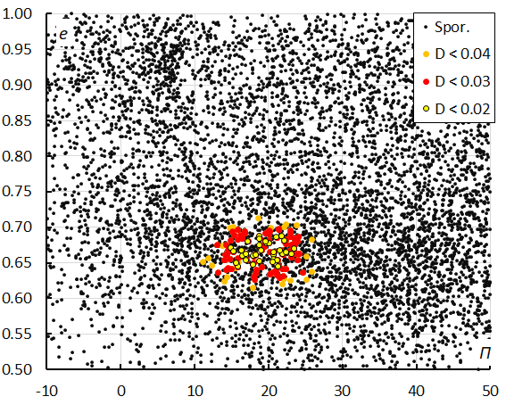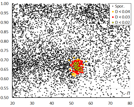 Figure 14 – The diagram of the eccentricity e versus the longitude of perihelion Π color-coded for different classes of D criteria thresholds, for λʘ between 196° and 207°.