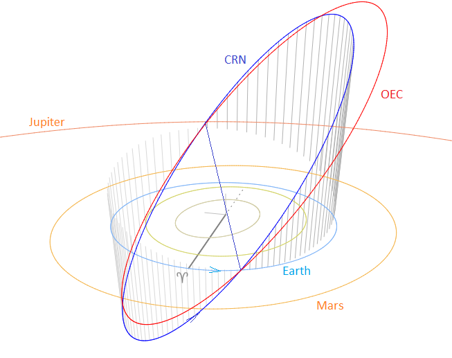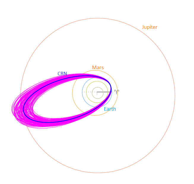 The Tisserand’s parameter relative to Jupiter, Tj (= 2.41) identifies the orbit as of a Jupiter Family Comet type orbit. Figure 16 compares the orbits of the A Carinids with the October epsilon-Carinids. The CRN meteoroid stream intersects the Earth orbit at its ascending node, hitting the planet from deep south of the ecliptic. The position of the descending node in the ecliptic plane is relatively close to the orbit of Jupiter. The CRN orbit is higher inclined to the ecliptic than the OEC orbit. Apart from the inclination, both streams differ mainly in longitude of perihelion with about 10°.