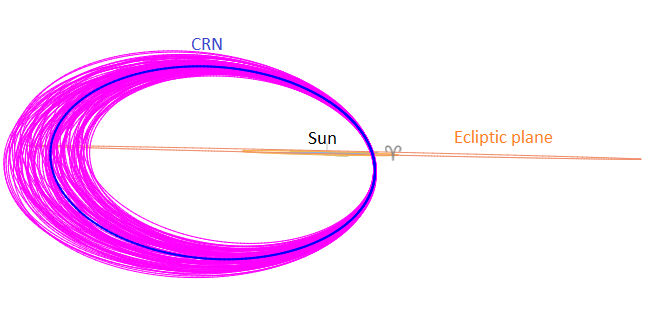 All 101 CRN-orbits recorded in 2025 that fit within DSH < 0.075, DD < 0.03 and DJ < 0.075 have been plotted in Figure 17 as seen in the ecliptic plane and in Figure 18 projected on the ecliptic plane. Despite the very strict D criteria cutoff values, the slightest uncertainty at the encounter with the Earth results in a large dispersion at the aphelia. In reality, the meteoroid stream will be more compact at its aphelion. The plotted dispersion is mainly due to measurement uncertainties.