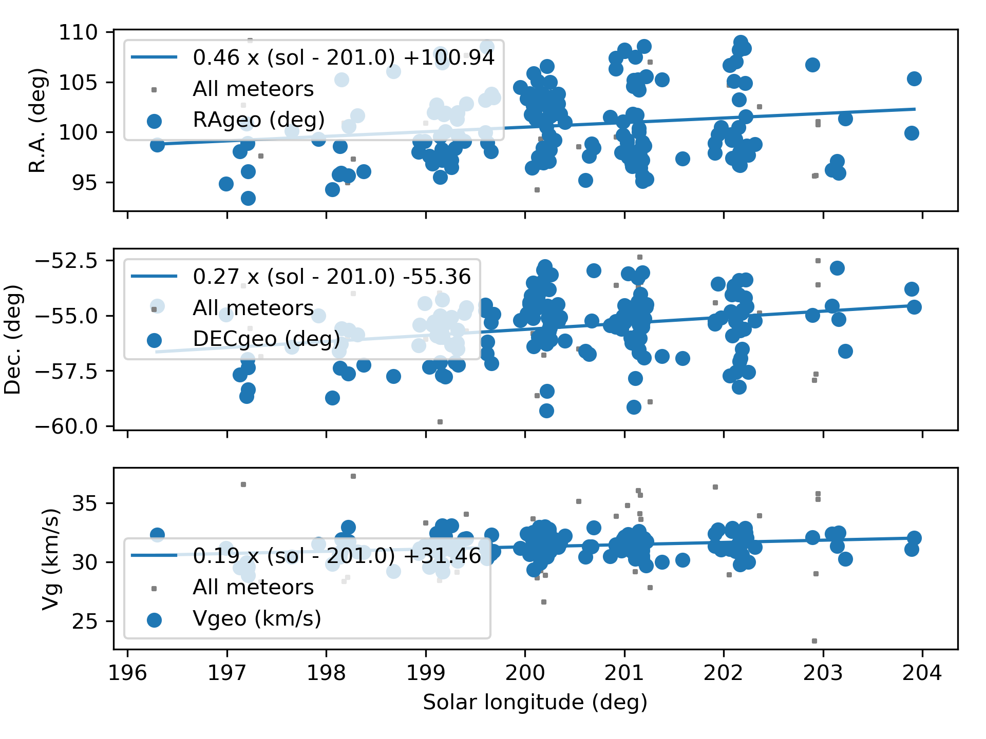 The shower was independently observed in 2025 by 186 cameras in Australia, Brazil, Chile, New Zealand and South Africa. The shower had a median geocentric radiant with coordinates R.A. = 100.9°, Decl. = –55.4°, within a circle with a standard deviation of ±2.0° (equinox J2000.0). The radiant drift in R.A. is +0.46° on the sky per degree of solar longitude and +0.27° in Dec., both referenced to λʘ = 201.0° (Figures 3 and 4). The uncorrected raw numbers of shower meteors per degree in solar longitude indicate that most CRN-meteors were recorded around λʘ = 201.0° (Figure 5). Figures 6 and 7 show that the A Carinids appeared on top of the sporadic background noise. The median Sun-centered ecliptic coordinates were λ – λʘ = 279.0°, β = –77.5° (Figure 8). The geocentric velocity was 31.5 ± 0.1 km/s. The shower parameters as obtained by the GMN method are listed in Table 1.