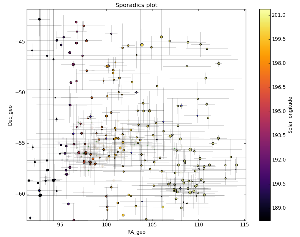 Figure 6 – All non-shower meteor radiants in geocentric equatorial coordinates during the shower activity. The pale diamonds represent the shower radiants plots, error bars represent two sigma values in both coordinates.