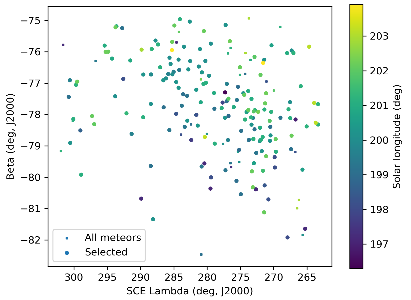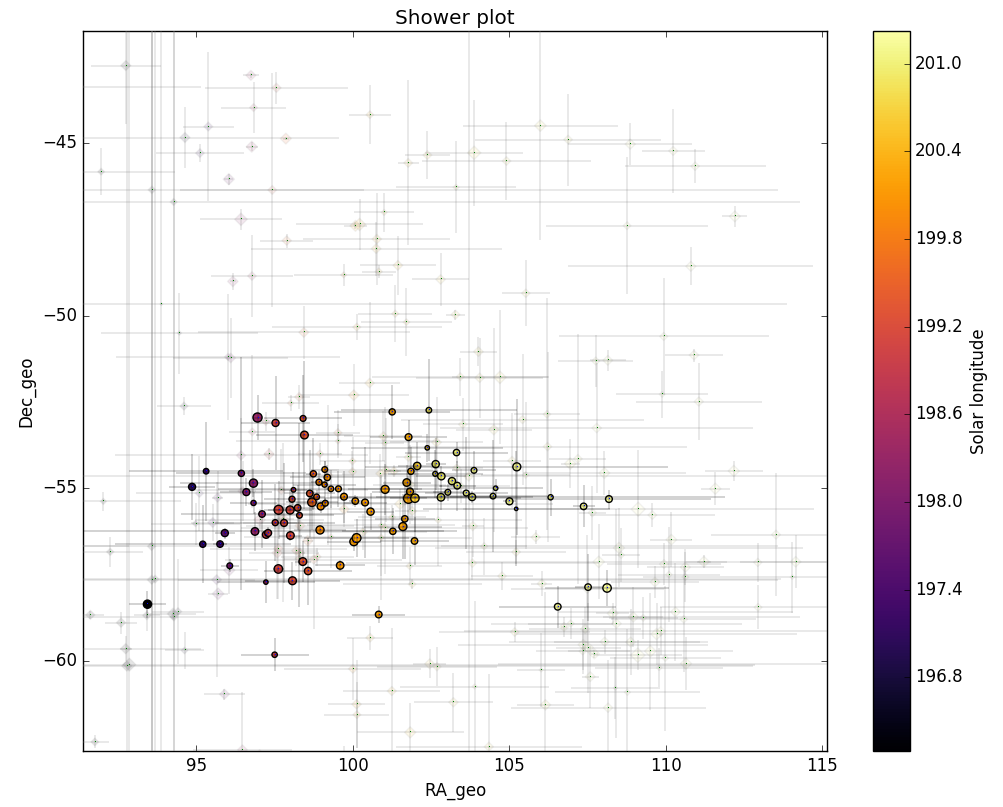 The GMN shower association criteria assume that meteors within 1° in solar longitude, within 4.9° in radiant in this case, and within 10% in geocentric velocity of a shower reference location are members of that shower. Further details about the shower association are explained in Moorhead et al. (2020). Using these meteor shower selection criteria, 171 orbits have been identified as A Carinids.