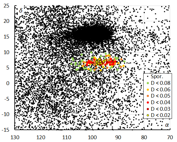 Figure 10 – The radiant distribution during the solar-longitude interval 208° – 229° in equatorial coordinates, color-coded for different threshold values of the DD orbit similarity criteria.
