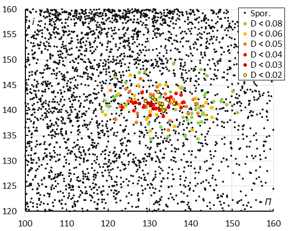 Figure 13 – The diagram of the inclination i versus the longitude of perihelion Π color-coded for different classes of D criteria thresholds, for λʘ between 208° and 229°.