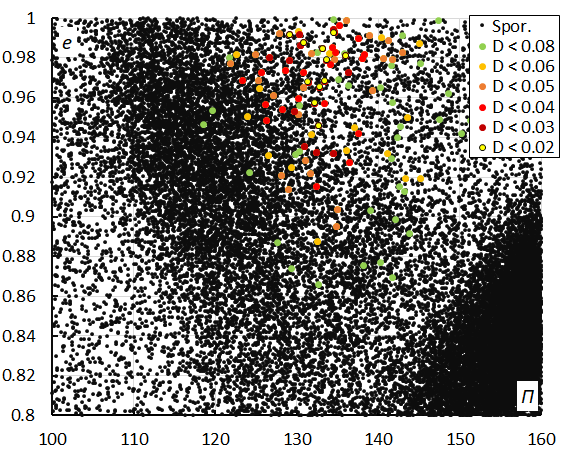 Figure 15 – The diagram of the eccentricity e versus the longitude of perihelion Π color-coded for different classes of D criteria threshold, for λʘ between 208° and 229°.