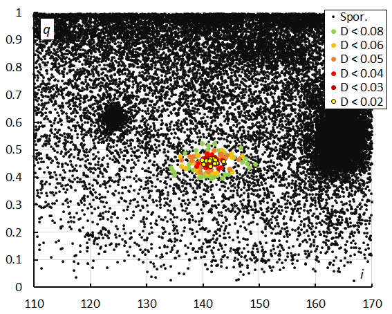 Figure 17 – The diagram of the perihelion distance q versus the inclination i color-coded for different classes of D criteria threshold, for λʘ between 208° and 229°.