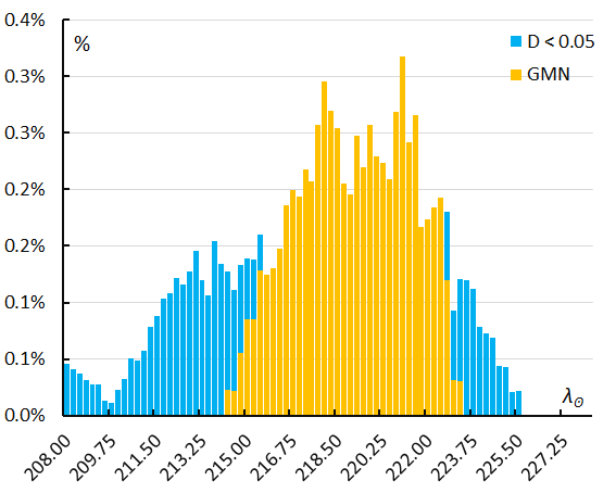 If we look at the ratio shower meteors to non-shower meteors recorded by GMN (Figure 12) in 2.0°-time bins in solar longitude in steps of 0.25°, we see that the orbit classification method identified M2025-V1 before λʘ = 214.0° and after λʘ = 223.0°, suggesting a longer activity period than what was covered by the radiant classification method. The fluctuations on the activity profile can be explained as due to small number statistics with 10 to 17 M2025-V1 meteors at best during each interval. Bad weather hampered many GMN cameras between λʘ = 221.0° – 227°.