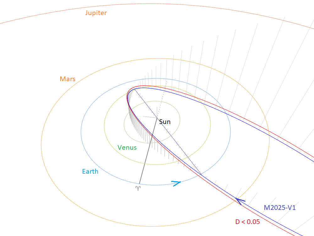 The Tisserand’s parameter relative to Jupiter, Tj (= –0.16) identifies the orbit as of a Long-Period Comet type orbit. Figure 18 compares two solutions as listed in Table 1 obtained by two different methods. The meteoroid stream encounters the Earth from south of the ecliptic at its ascending node. Figure 19 shows the orbits of the two solutions as viewed from another perspective. The orbit shower association method selected M2025-V1 meteors almost a week sooner than the radiant association method, with a slightly higher geocentric velocity that results in a higher eccentricity and larger semi-major axis.