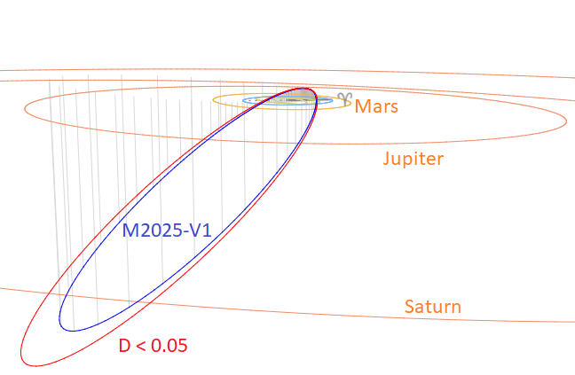 The diagram of eccentricity versus inclination shows M2025-V1 dispersed in eccentricity but rather narrow in inclination. Two other such trails are visible at i = 130° which is the kappa-Ursae Majorids (KUM#445), and at i = 124°, which is the Leonis Minorids (LMI#22), both dispersed in eccentricity. All these meteor showers have a high geocentric velocity of 60+ km/s and the slightest velocity measurement uncertainty results in a large dispersion in eccentricity which is very sensitive to error margins on velocity.